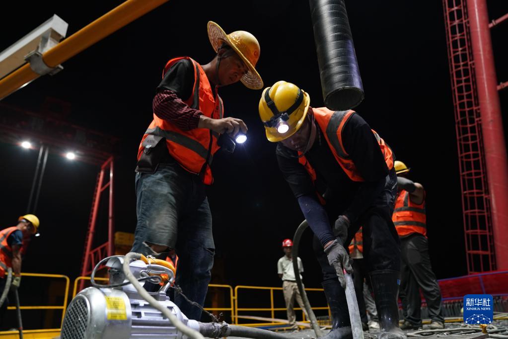 6月30日,施工人員在中鐵上海工程局藍田制梁場(chǎng)澆筑首榀預制箱梁。