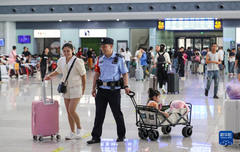 7月1日,江蘇淮安東站鐵路民警幫助出行的旅客。