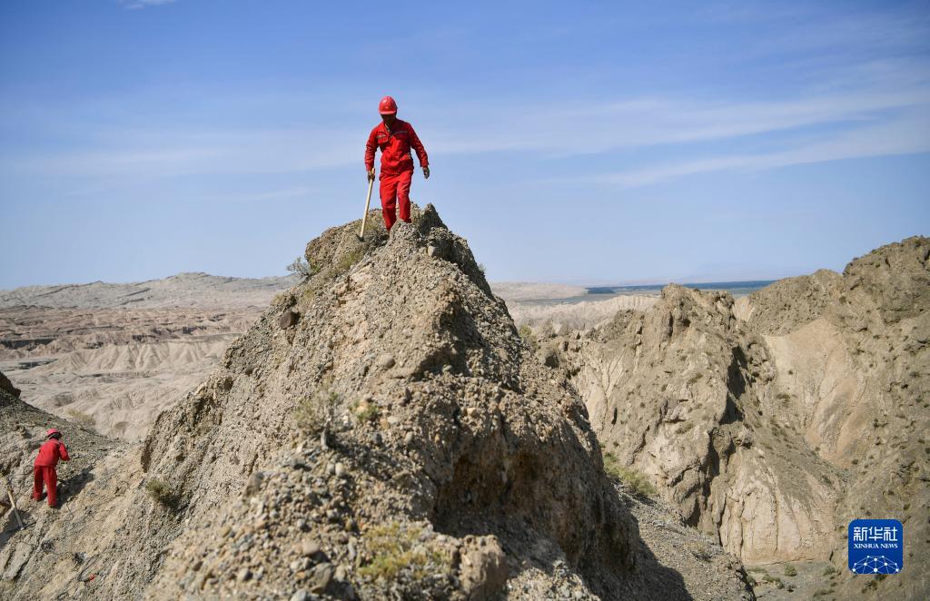 東方物探公司塔里木物探處2170隊放線(xiàn)班組的工人在山間施工(6月20日攝)。