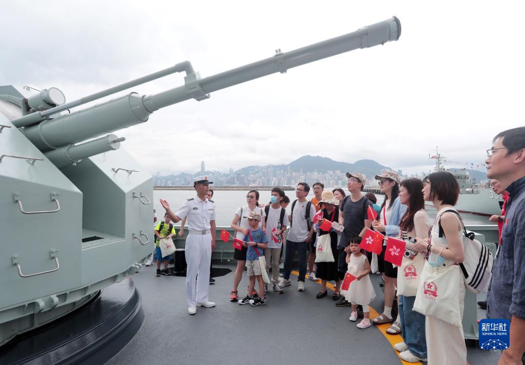 7月1日,在昂船洲軍營(yíng),解放軍官兵為參觀(guān)艦艇的香港市民講解武器裝備。