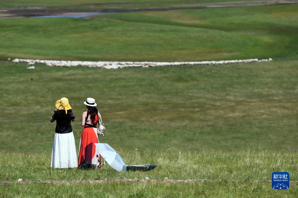 7月1日,兩名參加開(kāi)幕式的觀(guān)眾在活動(dòng)現場(chǎng)周邊眺望遠處的羊群。