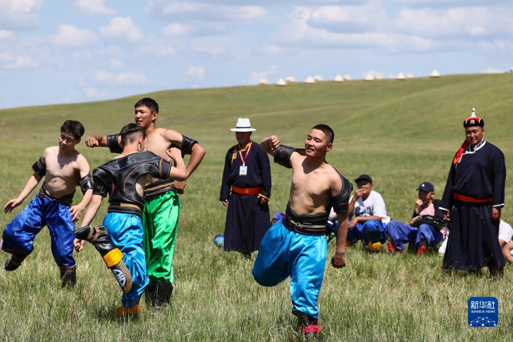 7月1日,參加搏克比賽的小選手們在上場(chǎng)前走“鷹步”。