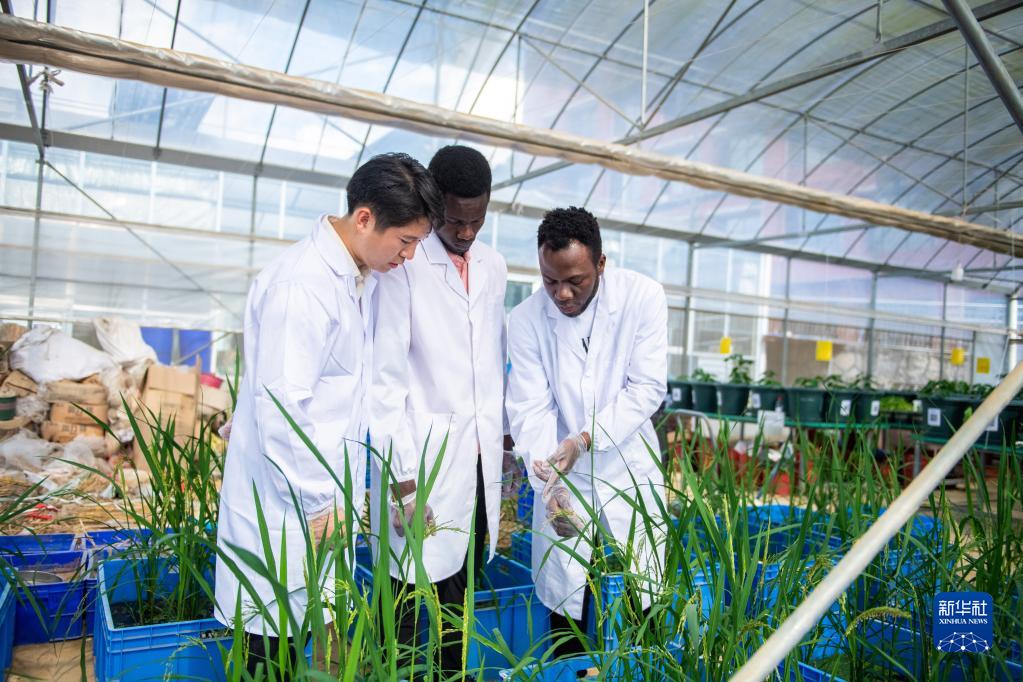 6月26日,尼克(右)和同學(xué)在湖南農業(yè)大學(xué)教學(xué)溫室大棚查看水稻長(cháng)勢。