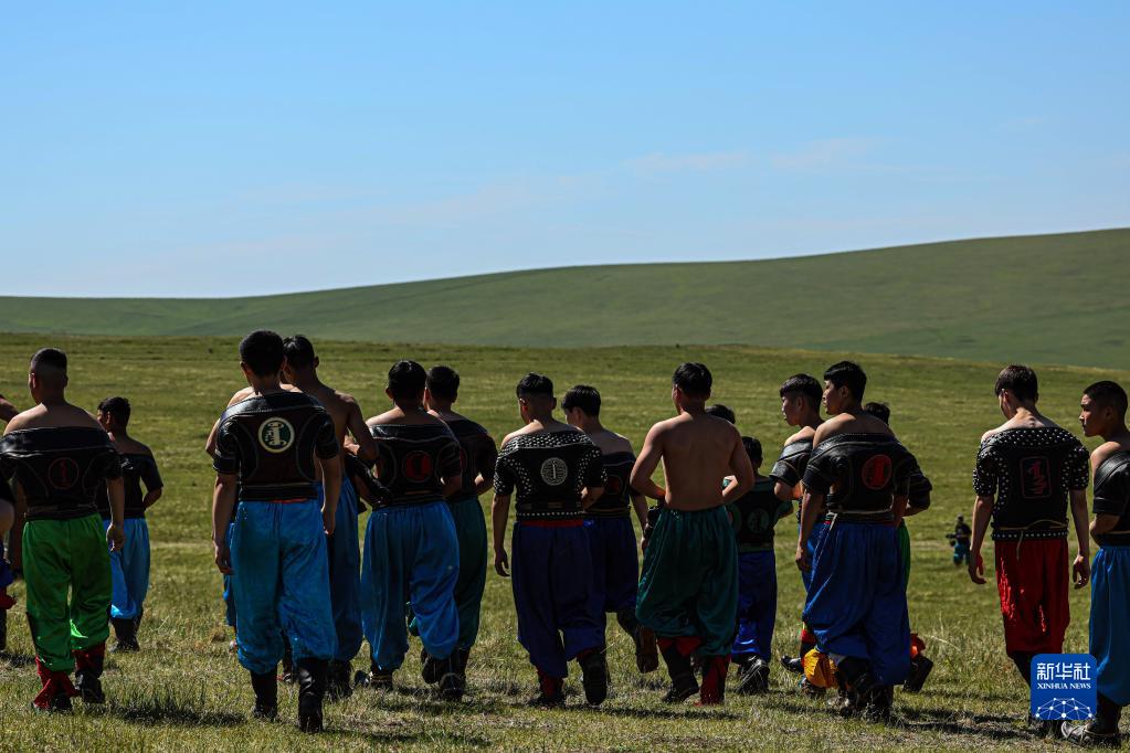 7月1日,在呼倫貝爾市陳巴爾虎旗,青少年搏克手們在草原上。