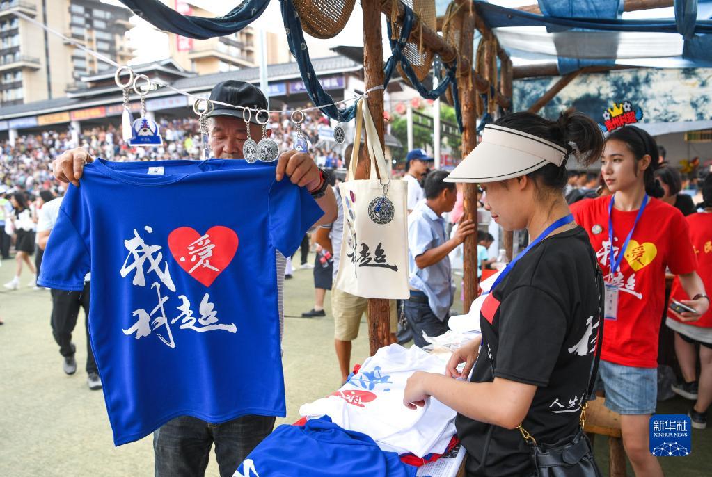 7月1日,游客在貴州“村超”足球賽場(chǎng)旁的文創(chuàng )攤位選購文化衫。