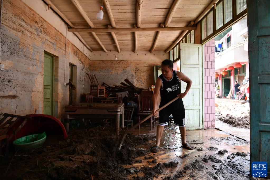 7月2日,在湖南省湘西土家族苗族自治州古丈縣巖頭寨鎮草潭村,村民在清理家中淤泥。