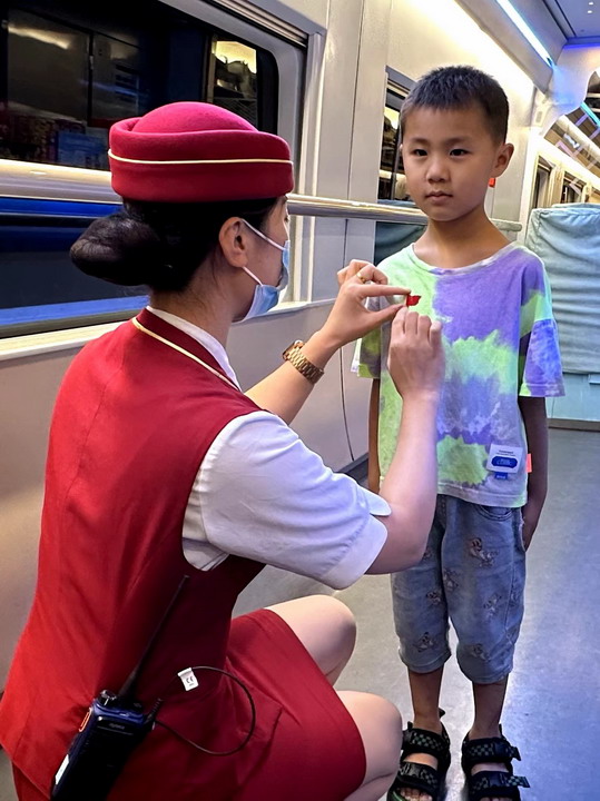 7月1日是黨的生日,也是暑運第一天,北京客運段G72次列車(chē)長(cháng)為小乘客整理胸前的五星紅旗章貼,同慶黨的生日。