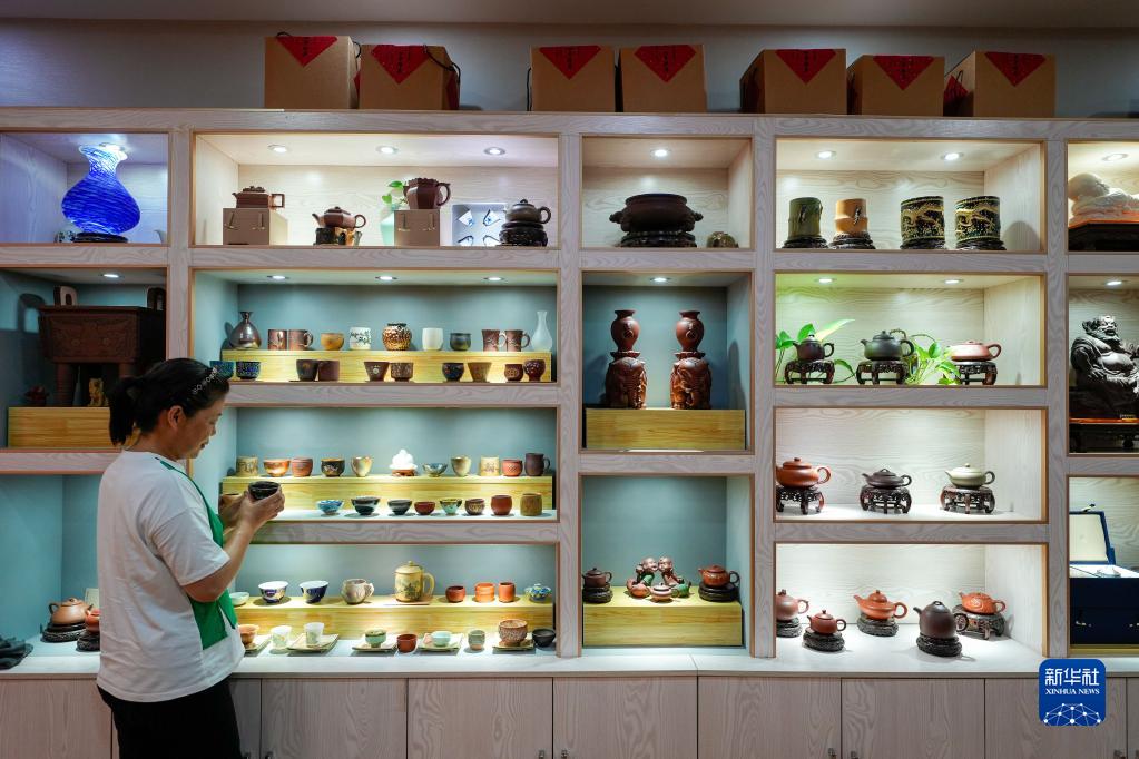 啟新1889文化創(chuàng )意產(chǎn)業(yè)園一家商鋪的工作人員在整理文創(chuàng )產(chǎn)品(7月2日攝)。