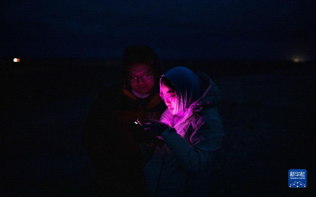 6月16日凌晨,連新明(左)和學(xué)生王子涵在青藏公路楚瑪爾河大橋附近,使用無(wú)人機監測藏羚羊遷徙途中的夜宿地。