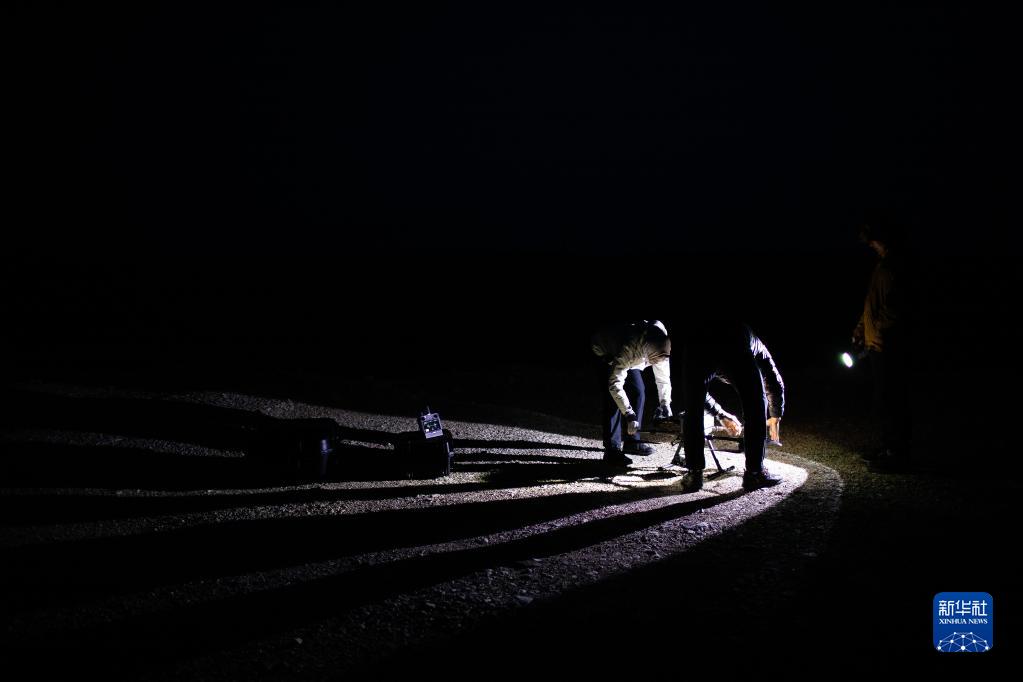 6月16日凌晨,連新明團隊在青藏公路楚瑪爾河大橋附近調試無(wú)人機,準備監測藏羚羊遷徙途中的夜宿地。