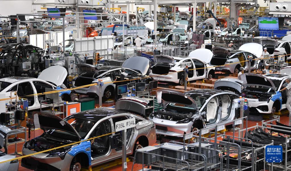 這是7月3日拍攝的廣州廣汽埃安第一智造中心新能源汽車(chē)總裝車(chē)間生產(chǎn)線(xiàn)。