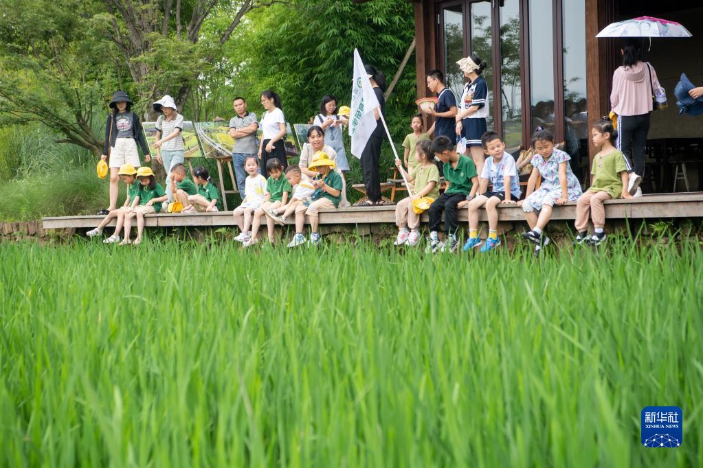 7月3日,家長(cháng)和孩子們在“生態(tài)研學(xué)課程”上學(xué)習辨識農作物。
