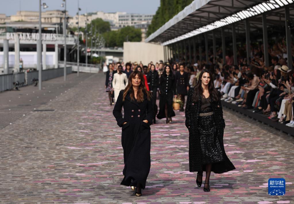 7月4日,在法國巴黎塞納河邊,模特展示法國品牌香奈兒2023/2024秋冬高級定制新品。