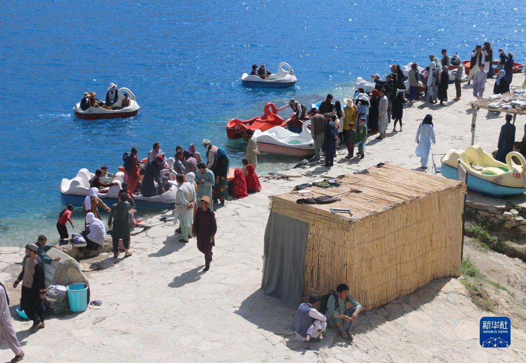 7月3日,游客在阿富汗巴米揚省班達米爾國家公園內的班達米爾湖上泛舟游玩。