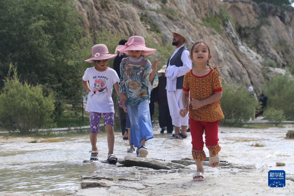 7月3日,兒童在阿富汗巴米揚省班達米爾國家公園內游玩。