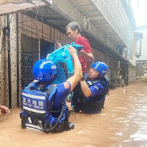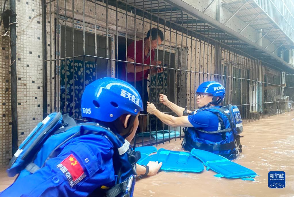 7月4日,藍天救援隊隊員在重慶市萬(wàn)州區五橋街道轉移被困群眾。