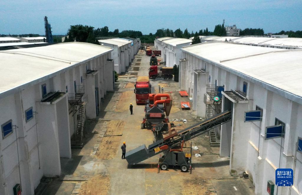 7月4日,河南鄧州國家糧食儲備庫的工作人員在進(jìn)行卸糧入庫作業(yè)(無(wú)人機照片)。