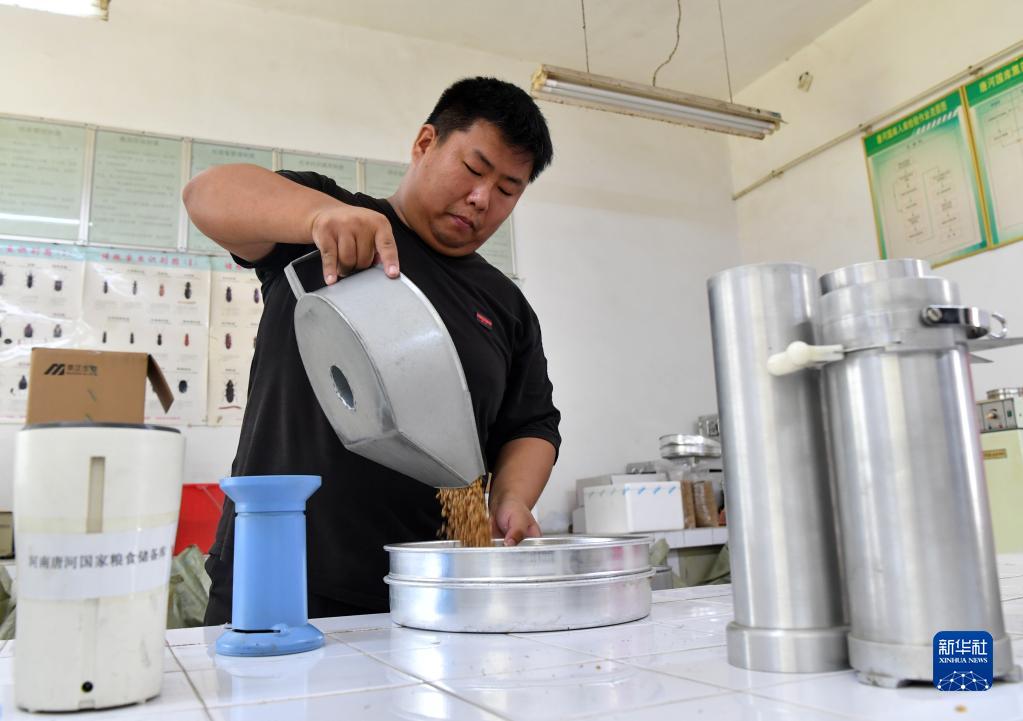 7月5日,河南唐河國家糧食儲備庫的工作人員對入庫小麥樣本進(jìn)行選篩。