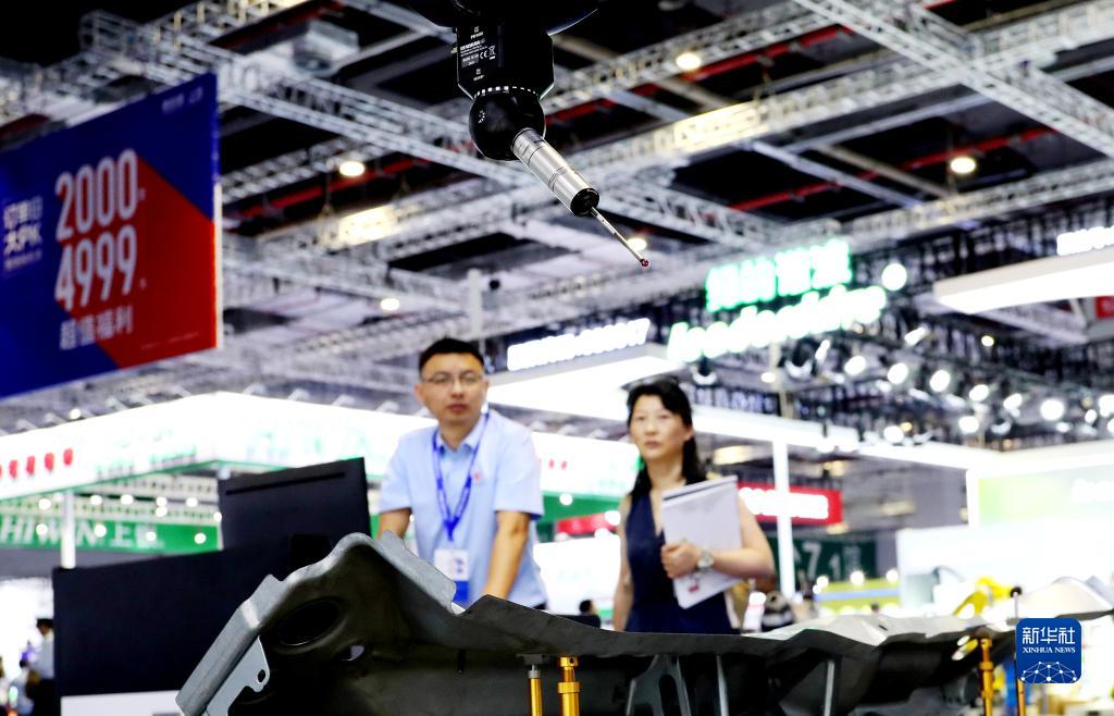 7月5日,參觀(guān)者在一臺進(jìn)行作業(yè)演示的三坐標測量機前駐足觀(guān)看。