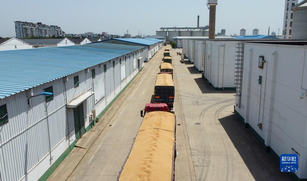 7月5日,運糧車(chē)在中央儲備糧天津東麗直屬庫有限公司大港分公司等待進(jìn)行卸糧作業(yè)(無(wú)人機照片)。