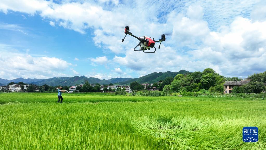 7月5日,在湖南省常寧市洋泉鎮坦沖村,農技員操作植保無(wú)人機進(jìn)行飛防作業(yè)(無(wú)人機照片)。