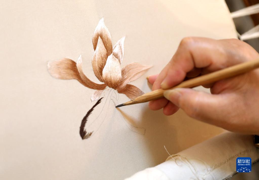 7月5日,王立君在位于遼寧省營(yíng)口市遼河老街上的工作室里進(jìn)行滿(mǎn)繡畫(huà)稿創(chuàng )作。