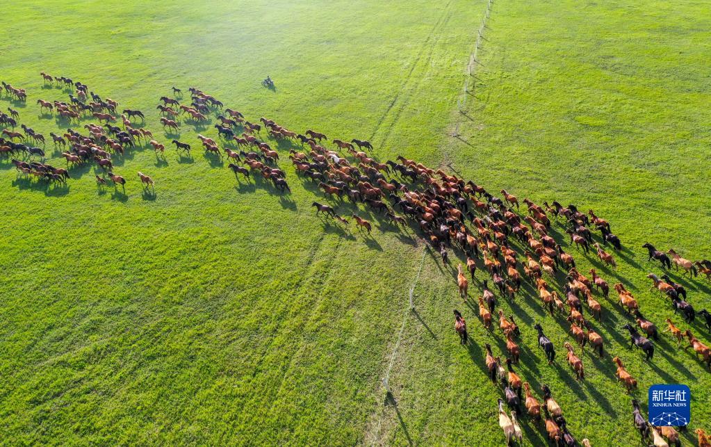 7月5日,馬群在草原上奔跑(無(wú)人機照片)。