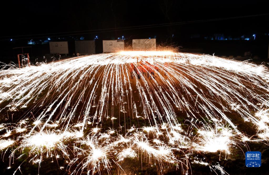“掄花”是河北省灤平縣一項傳統民俗,已被列入國家級非物質(zhì)文化遺產(chǎn)名錄。表演時(shí),幾名民間藝人將木炭和碎鐵片一起放到掛在花架上的花筒中燃燒,再合力掄起花架,使花筒內升溫并向四周甩濺鐵花,形成一圈圈光線(xiàn)交織的光環(huán),景象壯觀(guān)。