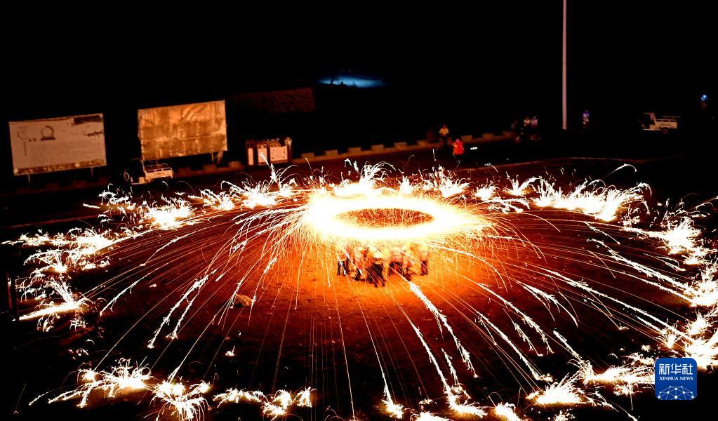 “掄花”是河北省灤平縣一項傳統民俗,已被列入國家級非物質(zhì)文化遺產(chǎn)名錄。表演時(shí),幾名民間藝人將木炭和碎鐵片一起放到掛在花架上的花筒中燃燒,再合力掄起花架,使花筒內升溫并向四周甩濺鐵花,形成一圈圈光線(xiàn)交織的光環(huán),景象壯觀(guān)。
