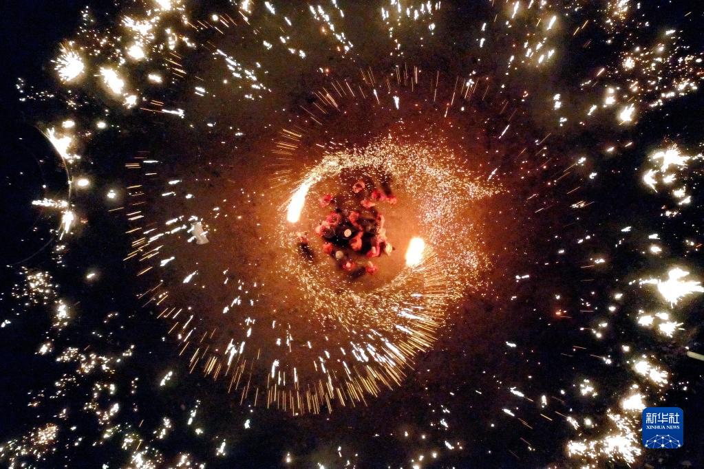 “掄花”是河北省灤平縣一項傳統民俗,已被列入國家級非物質(zhì)文化遺產(chǎn)名錄。表演時(shí),幾名民間藝人將木炭和碎鐵片一起放到掛在花架上的花筒中燃燒,再合力掄起花架,使花筒內升溫并向四周甩濺鐵花,形成一圈圈光線(xiàn)交織的光環(huán),景象壯觀(guān)。