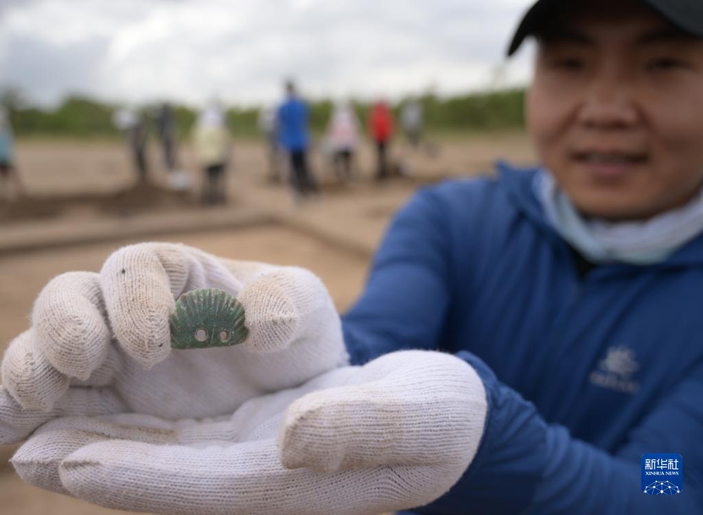7月5日,考古隊工作人員展示一件在遺址現場(chǎng)采集的文物。