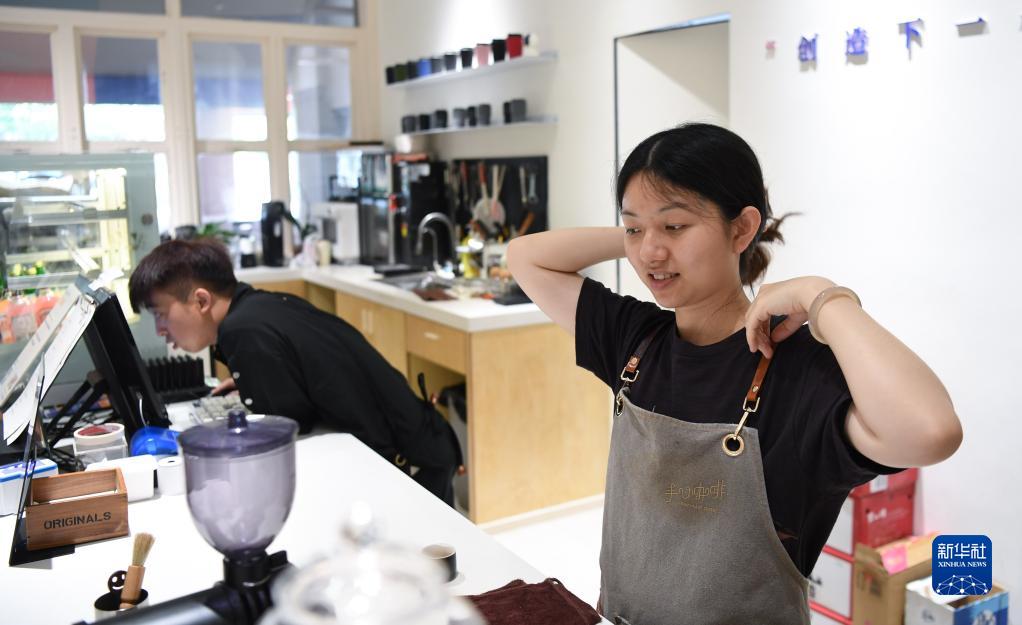 7月5日,視障咖啡師陳柳曉(右)在廣州市白云區的手心咖啡店內工作。