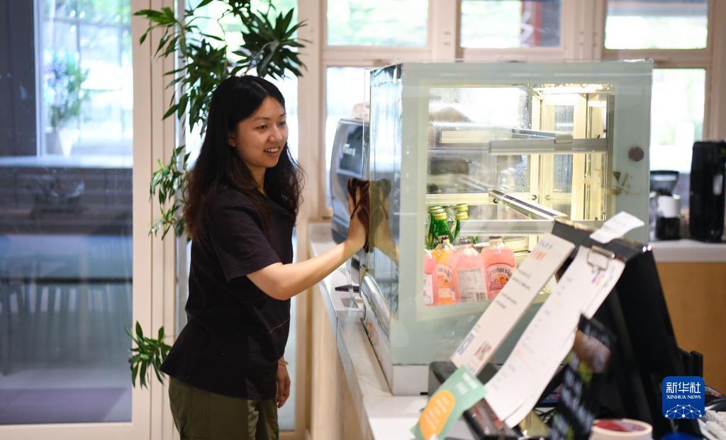 7月5日,在廣州市白云區的手心咖啡店,視障咖啡師陳柳曉在擦拭玻璃上冷凝的水滴。
