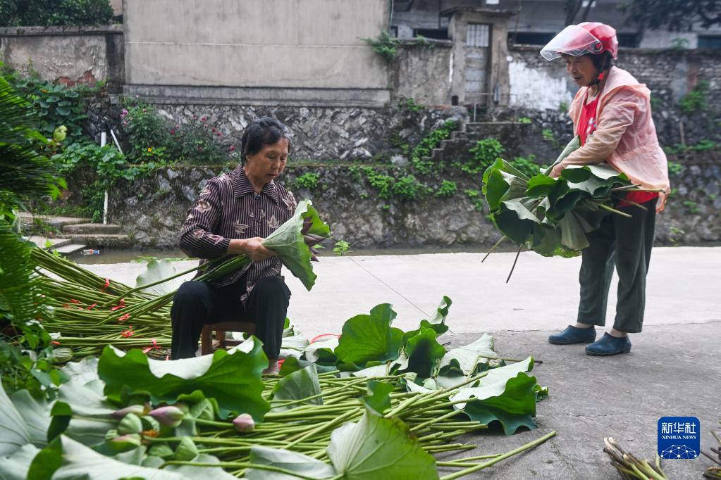 7月6日清晨,浙江省建德市大慈巖鎮里葉村村民在分類(lèi)打包剛采摘的荷花和蓮蓬。這些荷花和蓮蓬分類(lèi)包裝后,將快速運往江浙滬的花卉市場(chǎng)。