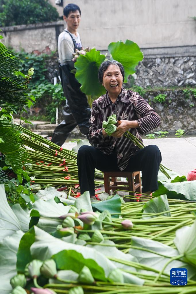 7月6日清晨,浙江省建德市大慈巖鎮里葉村村民在分類(lèi)打包剛采摘的荷花和蓮蓬。這些荷花和蓮蓬分類(lèi)包裝后,將快速運往江浙滬的花卉市場(chǎng)。