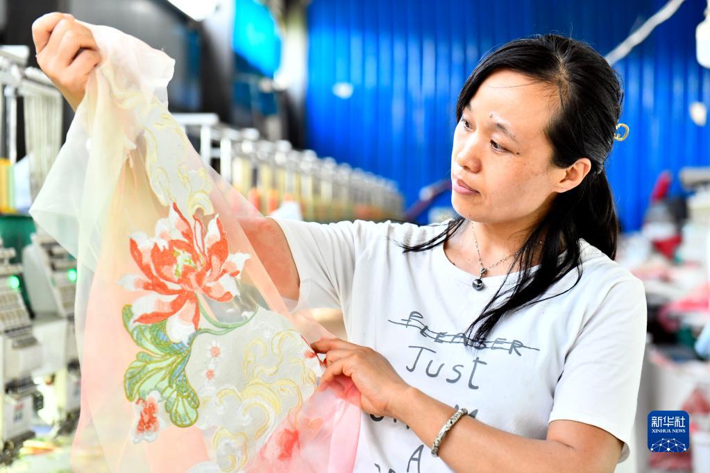 7月6日,在曹縣安蔡樓鎮李想繡花廠(chǎng),工作人員在查看繡花質(zhì)量。