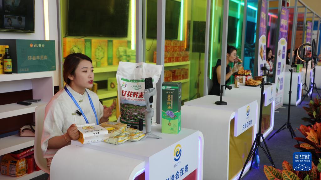7月6日,電商直播工作人員在第二十九屆中國蘭州投資貿易洽談會(huì )上進(jìn)行直播銷(xiāo)售。