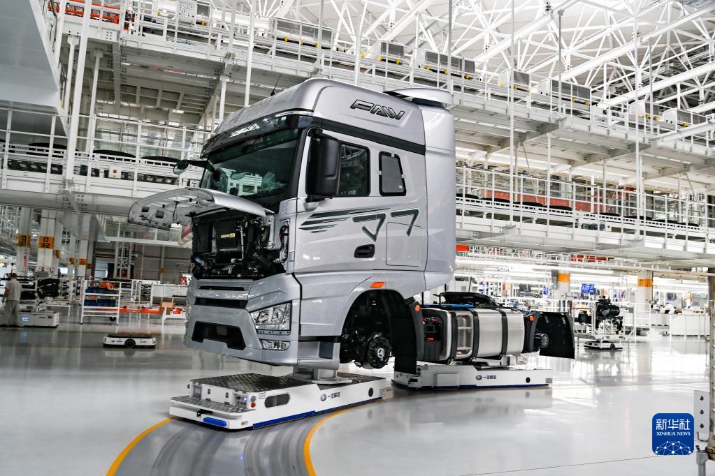 在位于吉林長(cháng)春的一汽解放汽車(chē)有限公司J7智能工廠(chǎng)內,AGV運載著(zhù)車(chē)輛行駛在車(chē)間內(6月12日攝)。