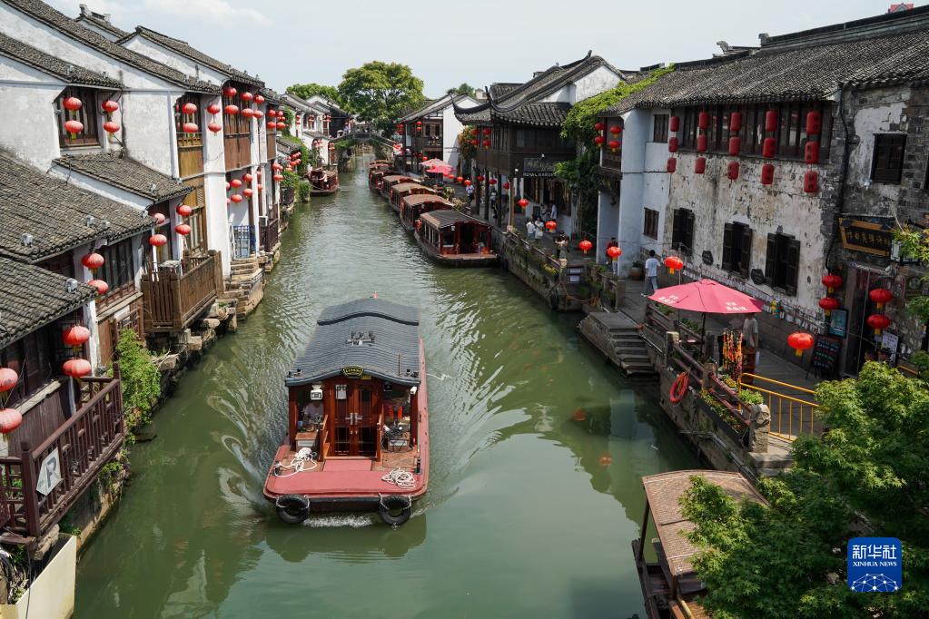 游客在蘇州山塘街休閑游玩(7月4日攝)。