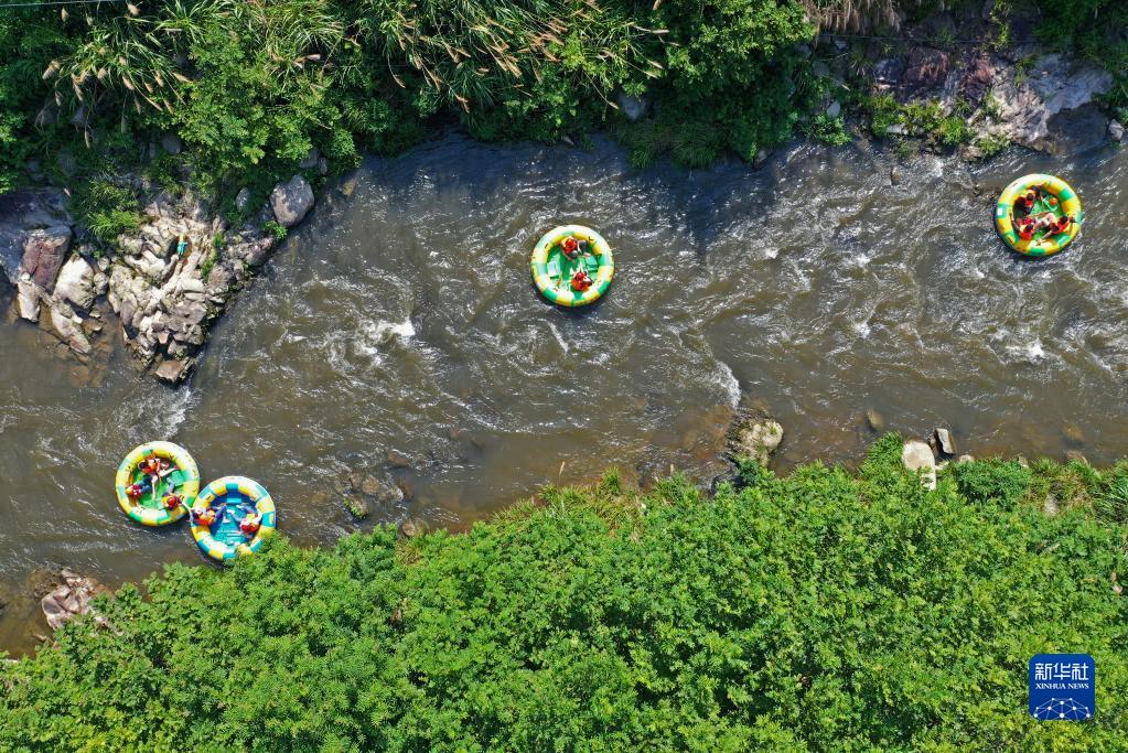 江西南昌連日高溫,人們來(lái)到郊外峽谷山澗,體驗漂流旅游項目,親近自然山水,享受夏日清涼。