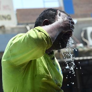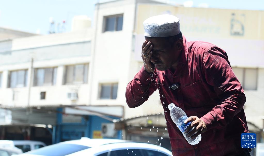 7月6日,一名男子在科威特首都省為自己潑水降溫。