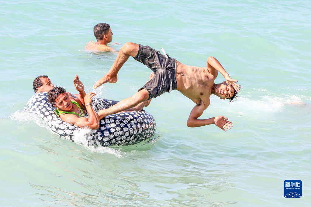 7月6日,人們在埃及亞歷山大的海邊游玩消暑。