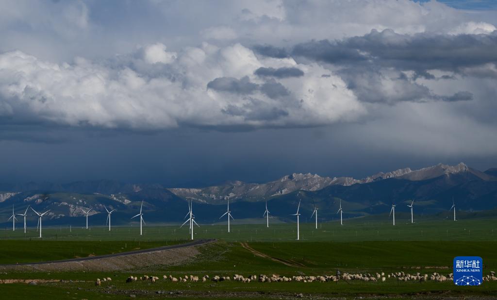 7月5日,羊群在天峻草原的一處風(fēng)電場(chǎng)附近漫步、吃草。
