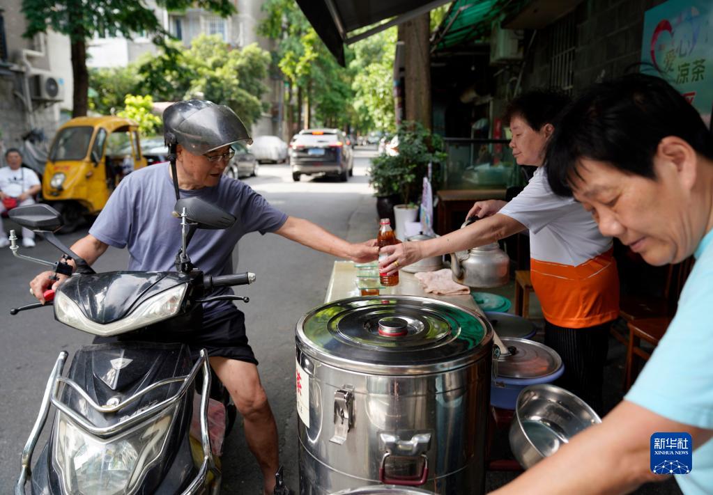 7月7日,杭州市濮家聯(lián)合社區愛(ài)心涼茶攤的志愿者為路過(guò)的社區居民送上涼茶。