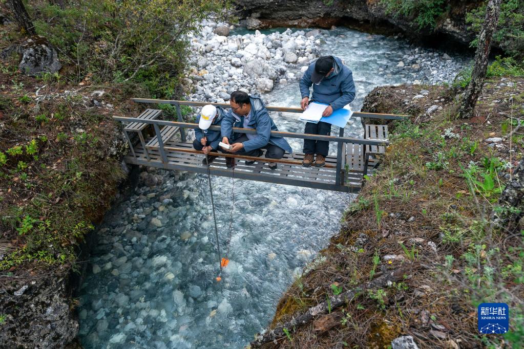 玉龍雪山站站長(cháng)王世金(中)和團隊成員在白水河水文觀(guān)測點(diǎn)測量冰川融水流速(6月16日攝)。