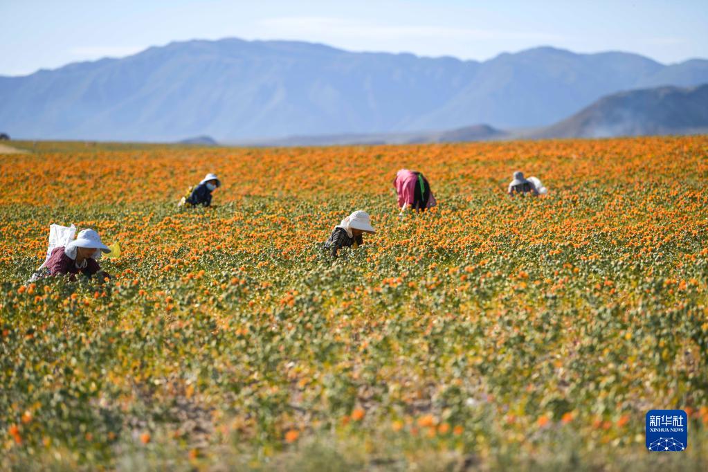 7月7日,采摘工人在新疆裕民縣江格斯鄉江格斯南村采收紅花絲。