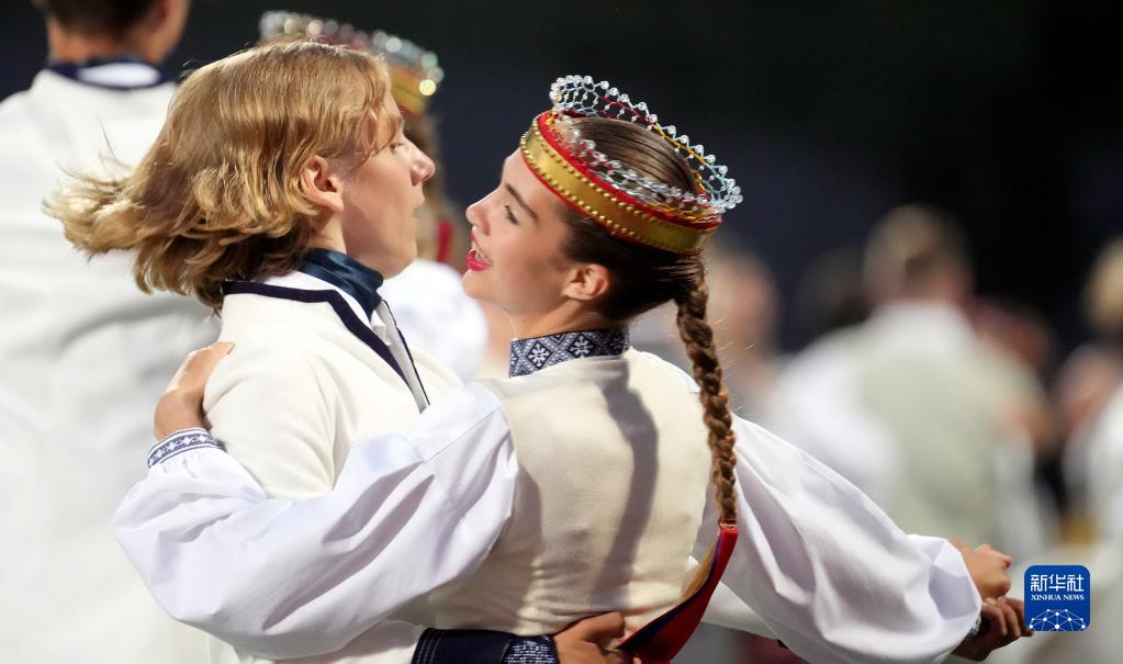7月6日,在拉脫維亞首都里加的道加瓦體育場(chǎng),人們參加大型團體舞蹈表演活動(dòng)。