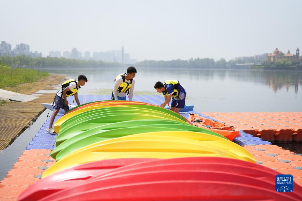 7月7日,學(xué)生在河北省遷安市灤河左岸體育公園內整理皮劃艇。