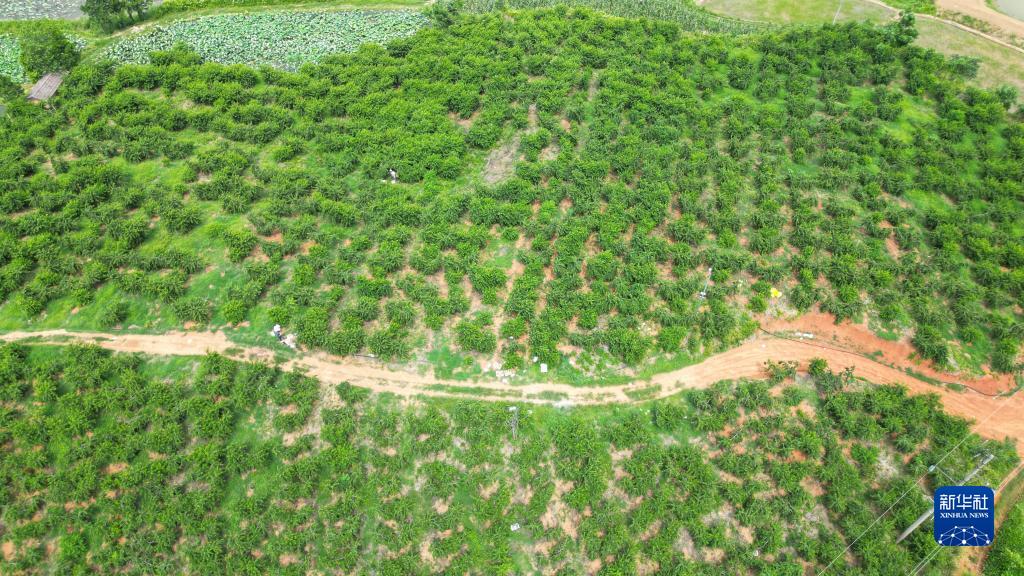 這是7月7日拍攝的臨湘市聶市鎮乘嶺社區的涓湖果園的一片蟠桃林(無(wú)人機照片)。