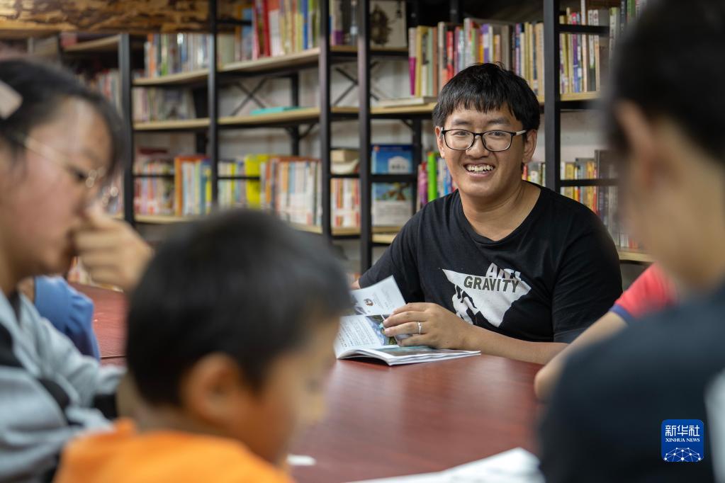 7月5日晚,甘文勇(左三)在“半山花語(yǔ)”書(shū)屋組織讀書(shū)活動(dòng)。新華社記者 費茂華 攝